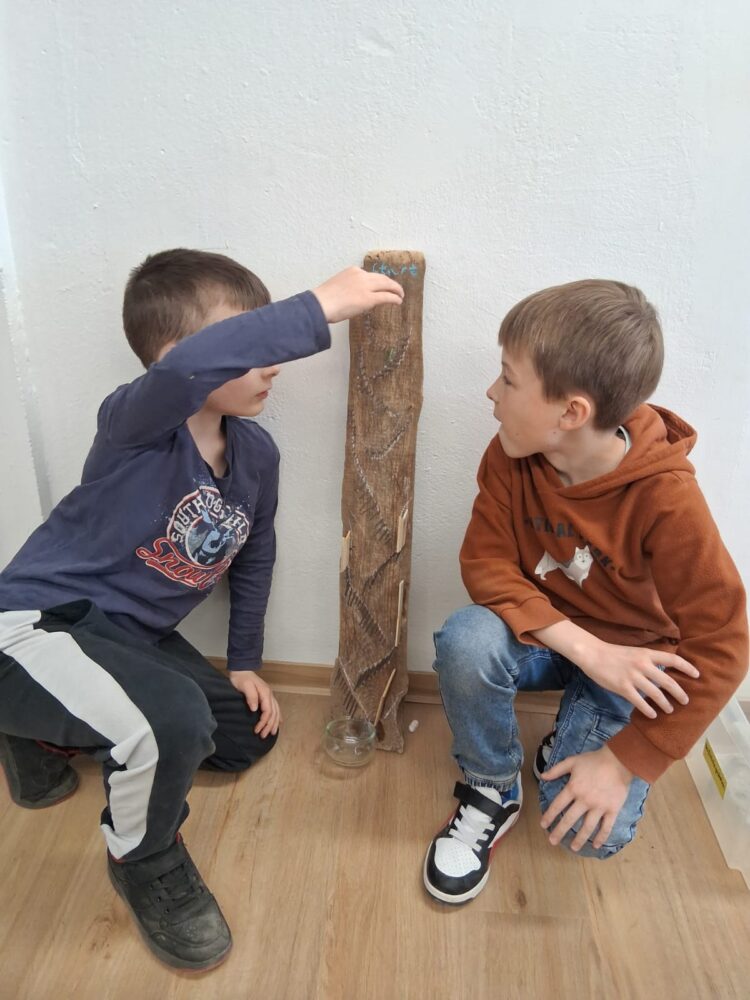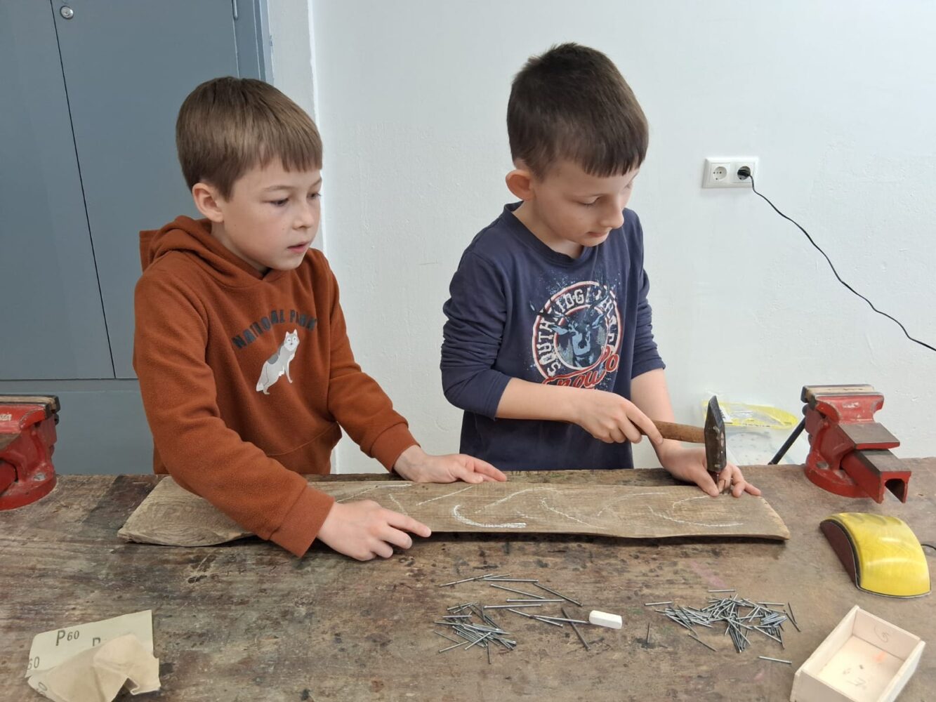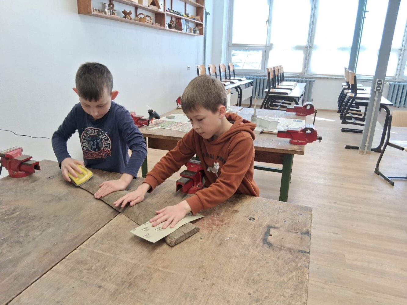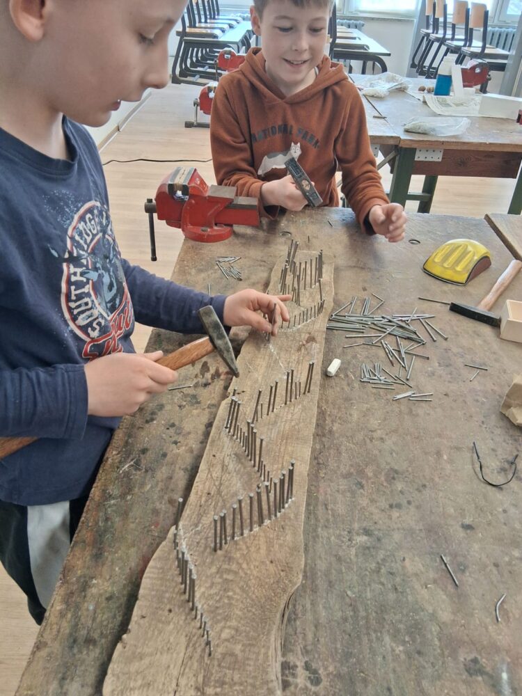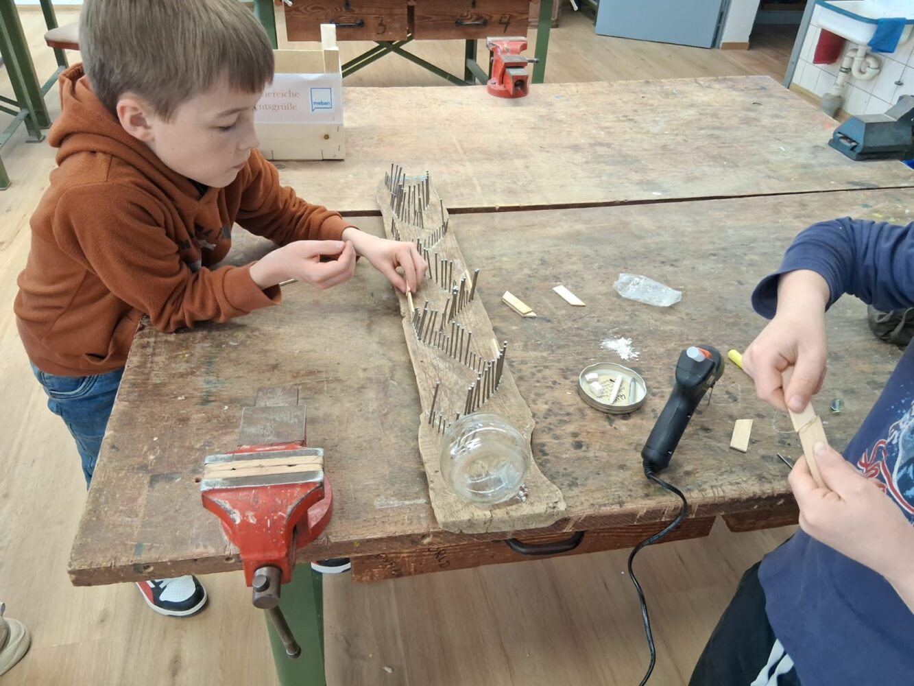 Faktor X in der Max Akademie hieß, für die Viert­klässler diesmal , den Hammer in die Hand zu nehmen und fleißig zu gebrau­chen. In Zwei­er­gruppen wurde im Upcy­cling eine Murmel­bahn gefer­tigt. Zuerst wurden die alten Zaun­bretter grob geschliffen. Im Anschluss erfolgte die Planung der Bahn. Als Ergebnis dieser Tätig­keit entstand eine Arbeits-Skizze. Nun ging es an das Einschlagen der Nägel. Dabei musste in Koope­ra­tion mit dem Partner gear­beitet werden. Zwischen­durch gab es eine kleine Stär­kung. Nach mehreren Probe­läufen waren die notwen­digen Stopper plat­ziert. Durch kleine Holz­klötz­chen, leere Schne­cken­ge­häuse oder das Richten einzelner Nägel, wurden die Lauf­wege frei. Über­ra­schend waren die unter­schied­li­chen Töne, die die Nägel, auf Grund ihrer  Länge und Dicke beim Aufprall der Murmeln, von sich gaben. Nach drei Stunden inten­siver Arbeit, konnten die runden Glas-Renner erfolg­reich ihren Weg durch die Bahn nehmen. Hut ab für den Fleiß und die Ausdauer aller Beteiligten. ‎