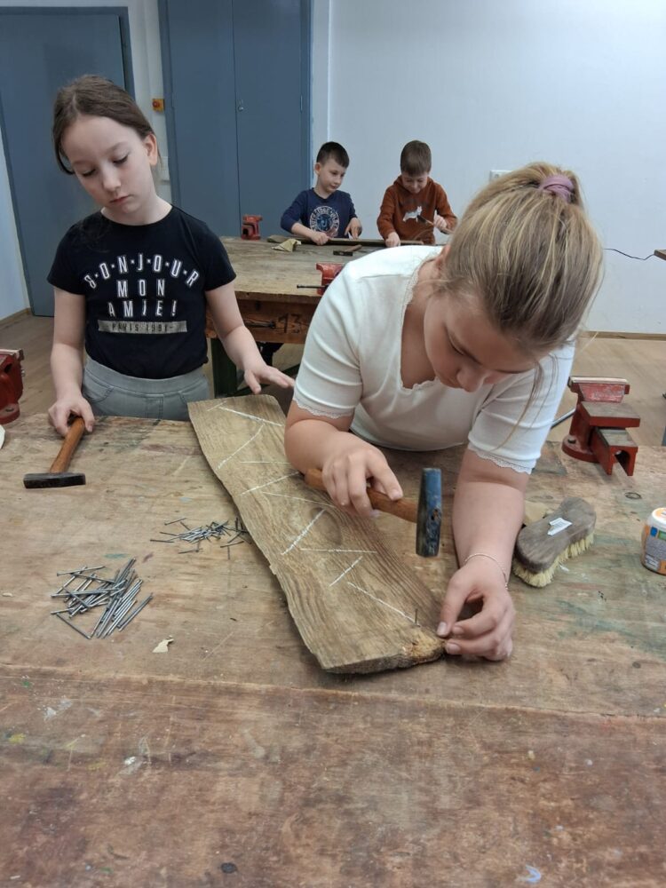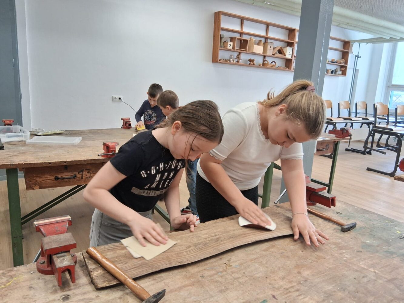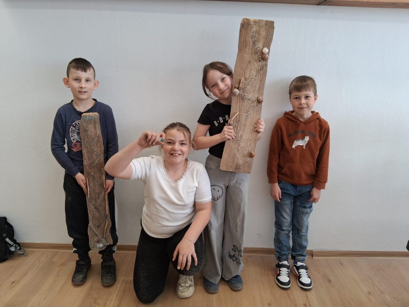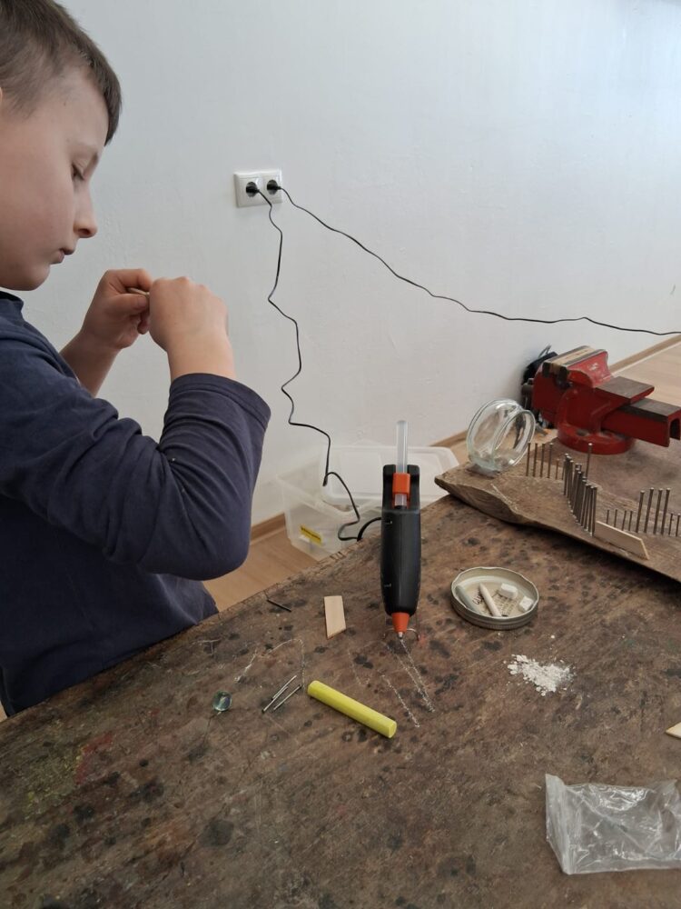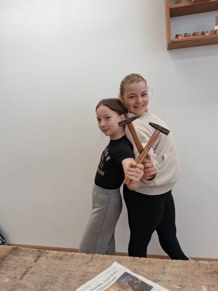 Faktor X in der Max Akademie hieß, für die Viert­klässler diesmal , den Hammer in die Hand zu nehmen und fleißig zu gebrau­chen. In Zwei­er­gruppen wurde im Upcy­cling eine Murmel­bahn gefer­tigt. Zuerst wurden die alten Zaun­bretter grob geschliffen. Im Anschluss erfolgte die Planung der Bahn. Als Ergebnis dieser Tätig­keit entstand eine Arbeits-Skizze. Nun ging es an das Einschlagen der Nägel. Dabei musste in Koope­ra­tion mit dem Partner gear­beitet werden. Zwischen­durch gab es eine kleine Stär­kung. Nach mehreren Probe­läufen waren die notwen­digen Stopper plat­ziert. Durch kleine Holz­klötz­chen, leere Schne­cken­ge­häuse oder das Richten einzelner Nägel, wurden die Lauf­wege frei. Über­ra­schend waren die unter­schied­li­chen Töne, die die Nägel, auf Grund ihrer  Länge und Dicke beim Aufprall der Murmeln, von sich gaben. Nach drei Stunden inten­siver Arbeit, konnten die runden Glas-Renner erfolg­reich ihren Weg durch die Bahn nehmen. Hut ab für den Fleiß und die Ausdauer aller Beteiligten. ‎