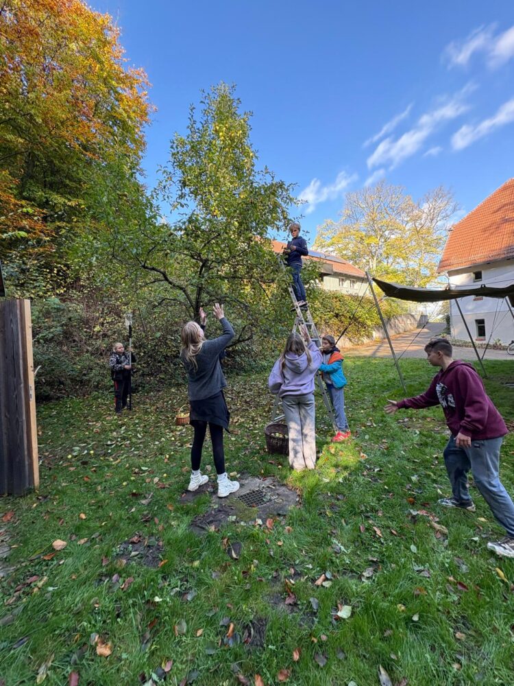 Nach dem Mittagessen wurden die letzten Äpfel des Jahres geerntet, und in Erwartung eines Lagerfeuers schnitzten die Kinder Grillstöcke. Leider machte der Regen diesen Plan zunichte, doch das Essen vom Grill schmeckte trotzdem und der Abend wurde mit Gruppenspielen zu einem schönen Abschluss des Tages.
