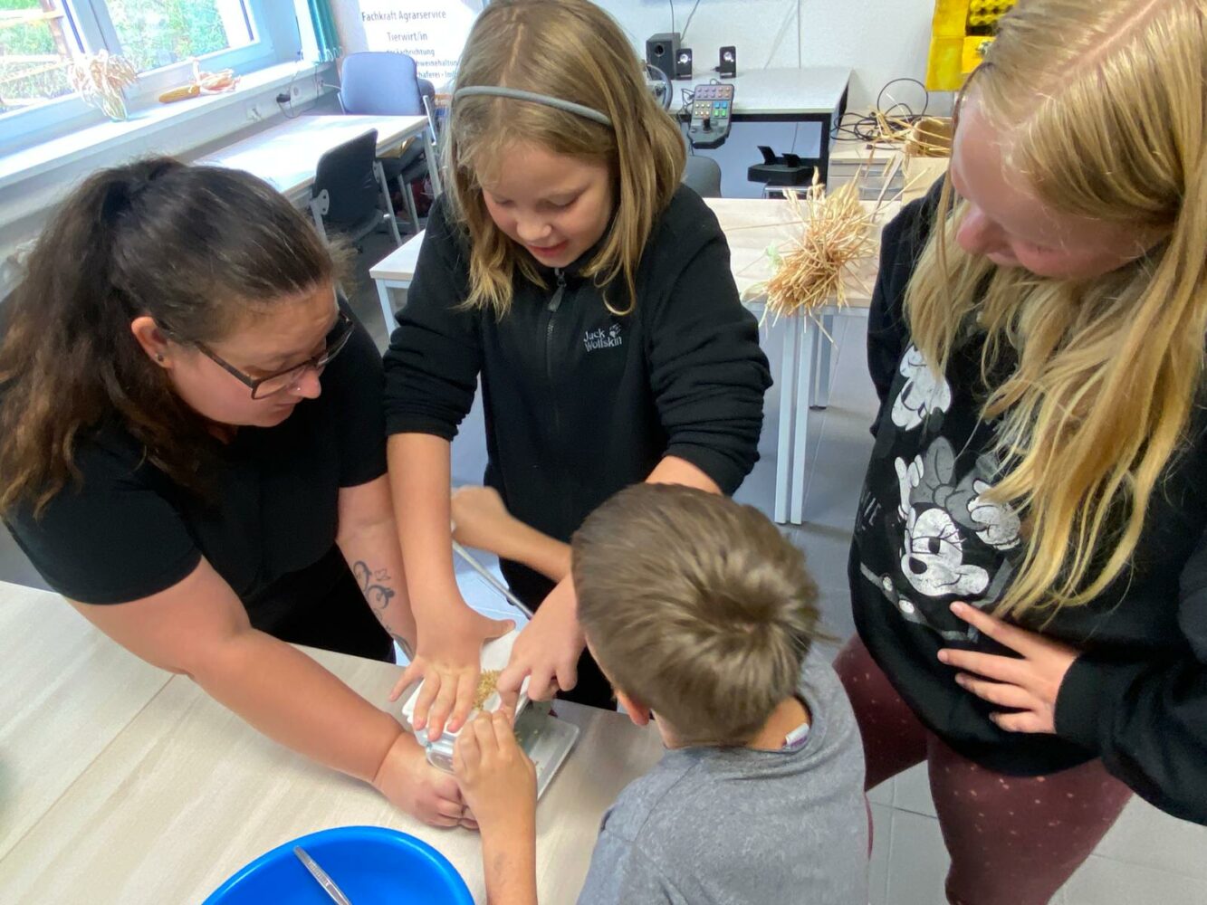 Besuch beim Bauernverband in Pasewalk. Nach der Begrüßung durch Martha Werner und Ursula Krüger vom Bauernverband wurden die Kinder spielerisch für das Tasten und Fühlen sensibilisiert. Im Anschluss musste das Hochbeet vom Unkraut befreit , „umgepflügt“ und das Saatkorn für den Winterroggen gedrillt (in die Erde gelegt) werden. Im Seminarraum nahm man anschließend alles genau unter die Lupe. Welches Getreide steckt in welchem Lebensmittel. Die „Jungbauern“ konnten Weizen mahlen und Hafer quetschen. Die Haferflocken wurden dann sogleich mit Joghurt verkostet. Jeder konnte eine kleine Mehlprobe mit nach Hause nehmen. Zusammen mit dem Mahlgut der kommenden Woche sollte es für ein, zwei Brötchen reichen. Da geht es nämlich nach Woldegk zum Müller. Was da wohl passiert?